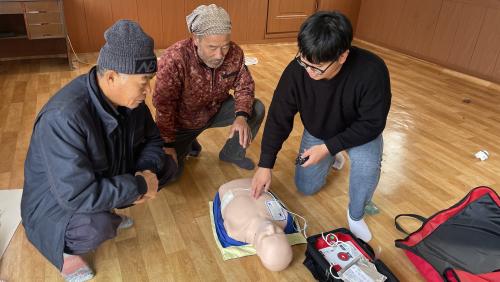 °¢ ¸¶À» °æ·Î´ç¿¡ ÀÚµ¿½ÉÀåÃæ°Ý±â¸¦ ¼³Ä¡Çϰí ÁֹεéÀ» ´ë»óÀ¸·Î ½ÉÆó¼Ò»ý¼ú°ú ÀÚµ¿½ÉÀåÃæ°Ý±â »ç¿ë¹ý ±³À°µµ ÇÔ²² ½Ç½ÃÇß´Ù.