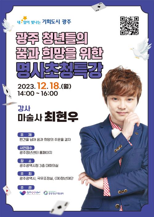 Ư°­ Âü¿©¸¦ Èñ¸ÁÇϴ û³âÀº ±¤ÁÖû³â¼¾ÅÍ È¨ÆäÀÌÁö¿¡ »çÀüÁ¢¼öÇÏ¸é µÈ´Ù. »çÀü Á¢¼öÀÚ Áß Ãß÷À» ÅëÇØ ÃÖÇö¿ì ¸¶¼ú»çÀÇ Ä£ÇÊ»çÀΠåÀÚ¸¦ Á¦°øÇÑ´Ù.