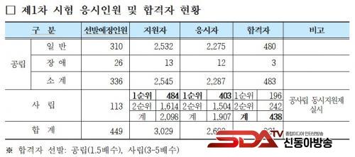 ÃÖÁ¾ 449¸í(°ø¸³ 336¸í, »ç¸³ 113¸í)À» ¼±¹ßÇÏ´Â À̹ø ½ÃÇè¿¡´Â 2,690¸íÀÌ ÀÀ½ÃÇØ Æò±Õ 6.75 ´ë 1ÀÇ Æò±Õ °æÀï·üÀ» º¸¿´À¸¸ç °ø¸³ 483¸í, »ç¸³ 438¸íÀÌ 1Â÷ °ü¹®À» Åë°úÇß´Ù.