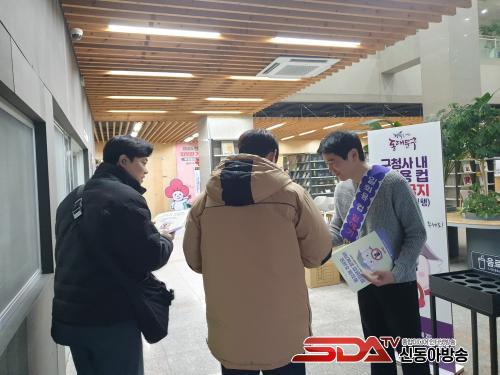 Ä«Æä ÀÌ¿ëÀÌ ¸¹Àº Ãâ±Ù½Ã°£°ú Á¡½É½Ã°£ µ¿¾È û»ç ÃâÀÔ±¸ ÂÊ¿¡¼ Á÷¿øµé°ú ¹Î¿øÀε鿡°Ô ÀÏȸ¿ëǰ ¹ÝÀÔ±ÝÁö¿¡ ´ëÇÑ ¾È³»¹®°ú ¿¡ÄÚ¹éÀ» Àü´ÞÇß´Ù. ±¸´Â ¾÷¹« ½Ã°£¿¡µµ ÃâÀÔ±¸¸¶´Ù ÀÏȸ¿ë ÄÅ ¹ÝÀÔ±ÝÁö µµ¿ì¹Ì¸¦ ¹èÄ¡ÇÏ¿© ÇÑ ´Þ°£ Ä·ÆäÀÎÀ» À̾°¥ ¿¹Á¤ÀÌ´Ù.