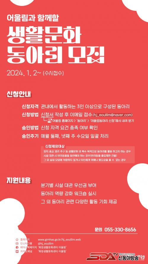 ½ÅûÇÏ·Á¸é ½Åû¼¿Í ȸ¿ø ¸í´ÜÀ» À̸ÞÀÏ(hj_eoullim@naver.com)·Î Á¦ÃâÇÏ¸é µÇ°í ÀÚ¼¼ÇÑ ³»¿ëÀº ÈÁ¤»ýȰ¹®È¼¾ÅÍ ¾î¿ï¸² SNS(ÀνºÅ¸±×·¥, ÆäÀ̽ººÏ ÆäÀÌÁö, īī¿Àä³Î)¸¦ Âü°íÇϰųª ÀüÈ(055-330-8656)·Î ¹®ÀÇÇÏ¸é µÈ´Ù.