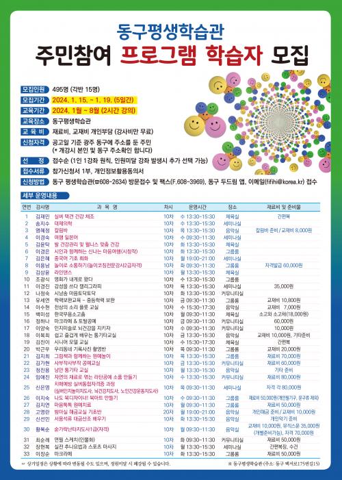 °Ç°­°­ÁºÎÅÍ ¹®È­¿¹¼ú°ú Á÷¾÷¿ª·® °­È­ ±³À°±îÁö ´Ùä·Î¿î ÇÁ·Î±×·¥¿¡ Âü¿©¸¦ ¿øÇÏ´Â ÁÖ¹ÎÀº ¿À´Â 19ÀϱîÁö Æò»ýÇнÀ°ü¿¡ ¹æ¹®¡¤Á¢¼öÇϰųª ¸ð¹ÙÀÏ ¾Û ¡®µ¿±¸ µÎµå¸²¡¯À» ÅëÇØ ¿Â¶óÀÎ ½ÅûÇÏ¸é µÈ´Ù.