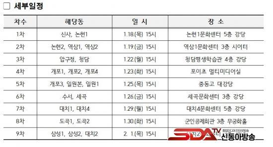 º¸°íȸ´Â °­³²±¸ 22°³ µ¿À» 2~3°³¾¿ ¹­¾î ÃÑ 9ȸ¿¡ °ÉÃÄ ÁøÇàÇÑ´Ù. ¼¼ºÎ ÀÏÁ¤À» º¸¸é. 1Â÷´Â ½Å»ç¡¤³íÇö1µ¿À¸·Î 1¿ù 18ÀÏ ³íÇö1¹®È­¼¾ÅÍ 5Ãþ °­´ç. 2Â÷ ³íÇö2¡¤¿ª»ï1¡¤¿ª»ï2µ¿ 1¿ù 19ÀÏ ¿ª»ï1¹®È­¼¾ÅÍ 3Ãþ ½Ã¾îÅÍ. 3Â÷ ¾Ð±¸Á¤¡¤Ã»´ãµ¿ 1¿ù 22ÀÏ Ã»´ãÆò»ýÇнÀ°ü 4Ãþ °­´ç. 4Â÷ °³Æ÷1¡¤°³Æ÷2¡¤°³Æ÷4µ¿ 1¿ù 23ÀÏ Æ÷ÀÌÃÊ ¸ÖƼ¹Ìµð¾î½Ç. 5Â÷ °³Æ÷3¡¤ÀÏ¿øº»¡¤ÀÏ¿ø1µ¿ 1¿ù 25ÀÏ Áßµ¿°í ´ë°­´ç. 6Â÷ ¼ö¼­¡¤¼¼°îµ¿ 1¿ù 26ÀÏ ¼¼°î¹®È­¼¾ÅÍ 3Ãþ °­´ç. 7Â÷ ´ëÄ¡1¡¤´ëÄ¡4µ¿ 1¿ù 29ÀÏ ´ëÄ¡4¹®È­¼¾ÅÍ 5Ãþ °­´ç. 8Â÷ µµ°î1¡¤µµ°î2µ¿ 1¿ù 30ÀÏ ±ºÀΰøÁ¦È¸°ü 3Ãþ ¹«±ÃȭȦ. 9Â÷ »ï¼º1¡¤»ï¼º2¡¤´ëÄ¡2µ¿ 2¿ù 1ÀÏ ´ëÄ¡2¹®È­¼¾ÅÍ 3Ãþ °­´ç¿¡¼­ ¿­¸°´Ù. ¸ðµÎ ¿ÀÈÄ 3½Ã¿¡ °³ÃÖÇϸç, ±¸Á¤¿¡ °ü½É ÀÖ´Â ÁÖ¹ÎÀÌ¸é ´©±¸³ª Âü¿©ÇÒ ¼ö ÀÖ´Ù.