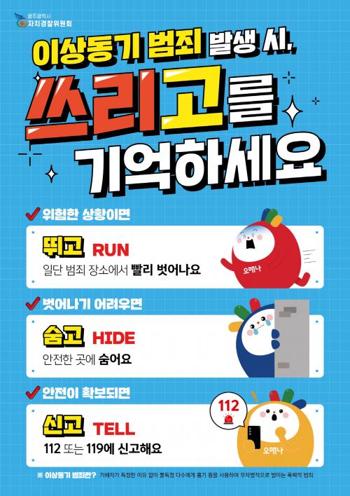 ¡®½Ã¹Î Çൿ¿ä·É ¾²¸®°í¡¯´Â ¡®¶Ù°í¡æ¼û°í¡æ ½Å°íÇØ¿ä¡¯ µî 3´Ü°è·Î ±¸¼ºµÅ ÀÖ´Ù. ±¤Áֽùο¡°Ô Ä£¼÷ÇÑ °ü±¤Ä³¸¯ÅÍÀÎ ¡®¿À¸Å³ª¡¯¸¦ Ȱ¿ëÇØ ÀÌÇØÇϱ⠽±°í Áï°¢ ´ëÀÀÀÌ °¡´ÉÇϵµ·Ï Á¦À۵ƴÙ.