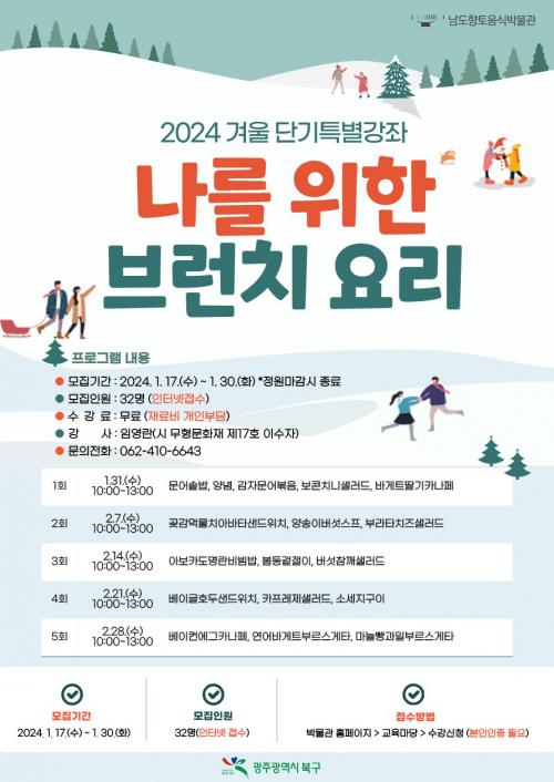 ¡®³ª¸¦ À§ÇÑ ºê·±Ä¡ ¿ä¸®¡¯ ÁÖÁ¦·Î ¿¸®´Â À̹ø °Á´ Áö¿ªÁֹΠ32¸íÀ» ´ë»óÀ¸·Î ¿î¿µ ±â°£ Áß ¸ÅÁÖ ¼ö¿äÀÏ ¿ÀÀü 10½ÃºÎÅÍ ¿ÀÈÄ 1½Ã±îÁö ÃÑ 5ȸ¿¡ °ÉÃÄ ¡®±¤Áֽà ¹«Çü¹®ÈÀç Á¦17È£(³²µµÀÇ·ÊÀ½½ÄÀå)¡¯ À̼öÀÚÀÎ ÀÓ¿µ¶õ °»çÀÇ ´Ù¾çÇÑ Ç»Àü ¿ä¸® À̷аú ½Ç½À ÇÁ·Î±×·¥À¸·Î ÁøÇàµÈ´Ù.