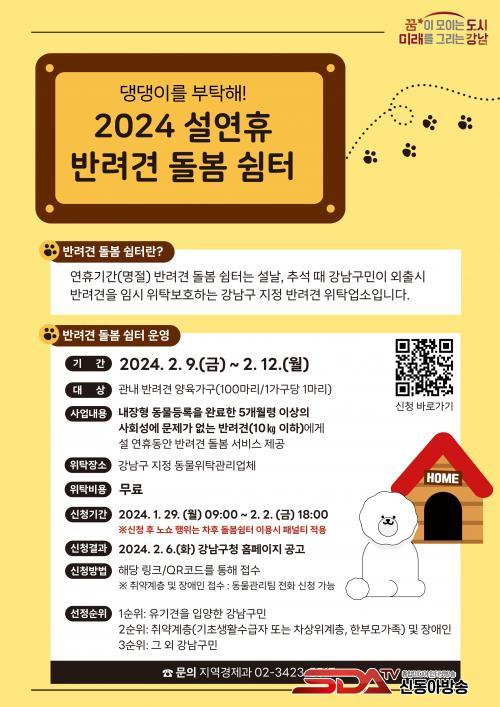 ±¸´Â °ü³» 6°³ÀÇ µ¹º½ À§Å¹¾÷ü¿Í Çù¾àÀ» ¸Î°í À̹ø ¼³ ¿¬ÈÞ ±â°£ ÃÖ´ë 4ÀϱîÁö ¹«·á·Î µ¹º½À» Áö¿øÇÑ´Ù. À̸¦ À§ÇØ ¹Ý·Áµ¿¹° È£ÅÚ¸µÀ» Àü¹®ÀûÀ¸·Î ÇÏ´Â ¾÷üÀÇ ½Ã¼³ ¹× Àη ±âÁØÀ» ²Ä²ÄÇÏ°Ô ÇöÀå Á¡°ËÇϰí À§Å¹ ¾÷ü¸¦ ¼±Á¤Çß´Ù. µ¿¹° µî·ÏÀ» ÇÑ 5°³¿ù·É ÀÌ»óÀÇ 10kg ÀÌÇÏ ¹Ý·Á°ß 100¸¶¸®¸¦ ´ë»óÀ¸·Î Çϸç, 1°¡±¸´ç 1¸¶¸®±îÁö ½ÅûÇÒ ¼ö ÀÖ´Ù. ½Åû ±â°£ ³» ±¸Ã» ȨÆäÀÌÁöÀÇ ±¸±Û ÆûÀ» ÅëÇØ Á¢¼öÇϸé, ½É»ç¸¦ ÅëÇØ 2¿ù 6ÀÏ ´ë»óÀÚ¸¦ ¹ßÇ¥ÇÒ ¿¹Á¤ÀÌ´Ù.