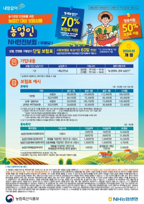 ¾ÈÀüº¸ÇèÀº ³ó¾÷ÀÎÀÌ ³óÀÛ¾÷ Áß ¹ß»ýÇÏ´Â ºÎ»ó¡¤Áúº´À̳ª ÀåÇØ Áø´ÜÀ» ¹Þ´Â °æ¿ì Ä¡·áºñ µîÀ» º¸»óÇÏ´Â º¸ÇèÀ¸·Î, º¸Àå ¼öÁØ¿¡ µû¶ó ÀϹÝ1ÇüºÎÅÍ »êÀ纸Çè ¼öÁØÀÇ »êÀçÇü »óǰÀÌ ÀÖ´Ù.