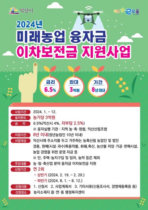 ¹Ì·¡³ó¾÷ À¶ÀÚ±Ý ÀÌÂ÷º¸Àü±Ý Áö¿ø»ç¾÷Àº Áö¿ª ³ó¡¤Ãࡤ¿øÇù¿¡¼ ³ó°¡´ç 3¾ï ¿ø±îÁö ´ëÃ⠽à ¹ß»ýÇÏ´Â 6.5%ÀÇ ´ëÃâÀÌÀ²¿¡ ´ëÇØ ÀÍ»ê½Ã°¡ 4%¸¦ Áö¿øÇÏ´Â »ç¾÷ÀÌ´Ù. ÃÖ´ë 8³â±îÁö Áö¿øµÇ°í û³â³ó¾÷ÀÎÀº ÃÖ´ë 10³â±îÁö ¿¬ÀåÇÒ ¼ö ÀÖ´Ù.