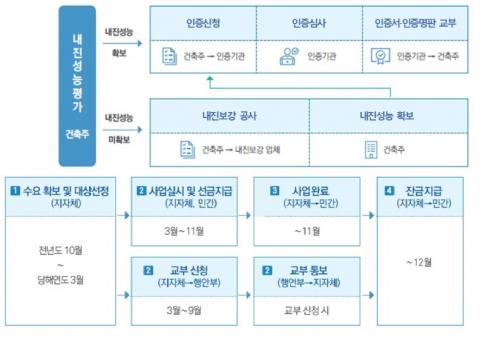 À̹ø Áö¿ø»ç¾÷Àº ±¹ºñ10%, Áö¹æºñ 10%, Àںδã80%·Î ½Ç½ÃµÇ¸ç ³»Áøº¸°°ø»ç¿¡ ¼Ò¿äµÇ´Â ºñ¿ëÀÇ 20%(ÃÖ´ë 5¾ï¿ø)À» Áö¿øÇÑ´Ù. ÁöÁø¾ÈÀü ½Ã¼³¹° ÀÎÁõÀýÂ÷ ÁøÇà Áß ³»Áø¼º´ÉÆò°¡ °á°ú°¡ ³»Áø¼º´É ¹ÌÈ®º¸·Î ³ª¿Â °æ¿ì, ¡®¹Î°£°ÇÃ๰ ³»Áøº¸°ºñ¿ë Áö¿ø »ç¾÷¡¯À» ÅëÇØ ³»Áøº¸° °ø»ç ºñ¿ëÀ» Áö¿ø¹ÞÀ» ¼ö ÀÖ´Ù.