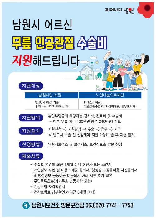 Áö¿ø´ë»óÀº Àΰø°üÀýġȯ¼ú(½½°üÀý) Áø´ÜÀ» ¹ÞÀº 65¼¼ÀÌ»ó ¾î¸£½ÅÀ¸·Î ½ÅûÀÏ ±âÁØ 1³âÀÌ»ó ³²¿ø½Ã¿¡ °ÅÁÖÇϰí, °Ç°º¸Çè·á ±âÁØ ÁßÀ§¼Òµæ 120%ÀÌÇÏÀÎ ÀÚ´Ù.