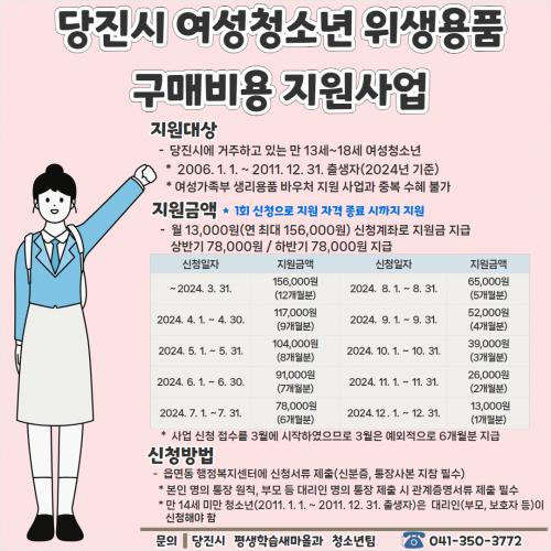 Áö¿ø ´ë»óÀº ´çÁø½Ã¿¡ Áֹεî·ÏÀ» µÎ°í ÀÖ´Â 13¼¼~18¼¼(2006³â 1¿ù 1ÀÏ~2011³â 12¿ù 31ÀÏ Ãâ»ýÀÚ)ÀÇ ¿©¼º û¼Ò³âÀÌ´Ù. ¶ÇÇÑ ´çÁø½Ã¿¡ ÁÖ¼ÒÁö°¡ µÇ¾î ÀÖ´Â µî·Ï¿Ü±¹ÀÎÀ̳ª ±¹³» °Å¼Ò ½Å°íµÈ ¿Ü±¹ ±¹Àû ¿©¼º û¼Ò³â¿¡°Ôµµ À§»ý¿ëǰ ±¸¸Åºñ°¡ Áö¿øµÈ´Ù.