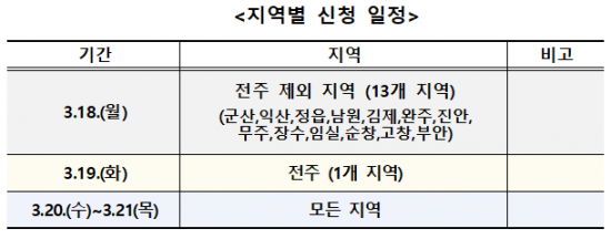 ½ÅûÀÚ µ¿½Ã Á¢¼Ó ÆøÁõ µî °úºÎÇϸ¦ ¹æÁöÇϱâ À§ÇØ ¡â3¿ù 18ÀÏ¿¡´Â ÀüÁÖ¸¦ Á¦¿ÜÇÑ 13°³ Áö¿ª ¡â19ÀÏ¿¡´Â ÀüÁÖ Áö¿ª ¡â3¿ù 20~21ÀÏ¿¡´Â ¸ðµç Áö¿ª¿¡¼ ½ÅûÇÒ ¼ö ÀÖµµ·Ï ÀÏÁ¤À» ºÐ»êÇß´Ù.