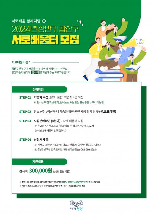 ±¤»ê±¸´Â ÇöÀç »ó¹Ý±â ¹è¿òÅÍ(3~6¿ù)¸¦ ¸ðÁýÇϰí ÀÖ´Ù. ºÐ¾ßº° 3°³¾¿ 12°³ ¹è¿òÅ͸¦ ¼±Âø¼ø Á¢¼öÇÑ´Ù. ¡®¼·Î ¹è¿òÅÍ¡¯¿Í °ü·ÃÇÑ ÀÚ¼¼ÇÑ »çÇ×Àº ±¤»ê±¸ ±³À°µµ¼°ü°ú Æò»ýÇнÀÆÀÀ¸·Î ¹®ÀÇÇÏ¸é µÈ´Ù.