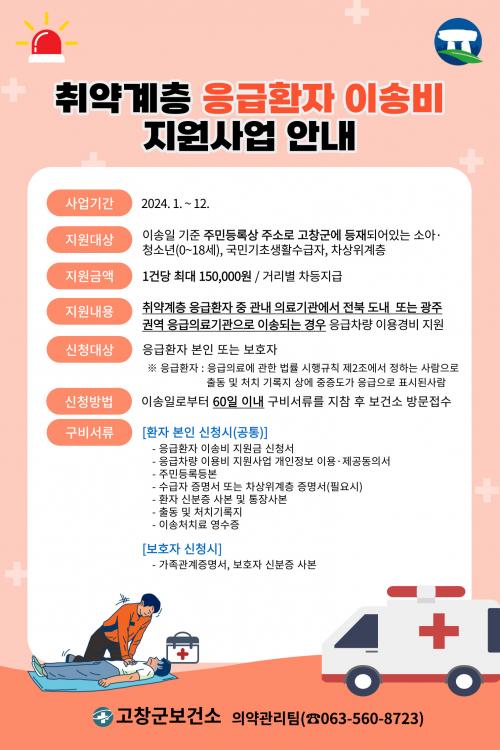 Áö¿ø´ë»óÀº ¼Ò¾Æ¡¤Ã»¼Ò³â(0~18¼¼)°ú ±¹¹Î±âÃÊ»ýȰ¼ö±ÞÀÚ, Â÷»óÀ§ °èÃþÀÌ ÇØ´çµÈ´Ù. ÀÀ±ÞȯÀÚ·Î °íâÁö¿ª ÀÇ·á±â°ü¿¡¼ ÀüºÏ µµ³» ¹× ±¤Áֱǿª ÀÀ±ÞÀÇ·á±â°üÀ¸·Î ÀÌ¼ÛµÈ °æ¿ì, ÀÀ±ÞÂ÷·® ÀÌ¿ë°æºñ¸¦ Áö¿øÇÑ´Ù.