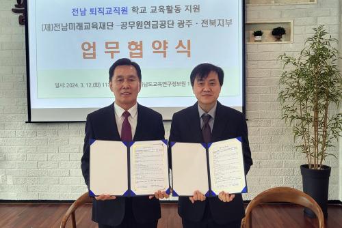 [½Åµ¿¾Æ¹æ¼Û=À̺´½Ä±âÀÚ] Àü³²¹Ì·¡±³À°Àç´Ü(¿øÀå À̱æÈÆ)°ú °ø¹«¿ø¿¬±Ý°ø´Ü ±¤ÁÖ¡¤ÀüºÏ ÁöºÎ(ÁöºÎÀå Á¶¿µÃ¶)°¡ 12ÀÏ Àü³²±³À°Ã»±³À°¿¬±¸Á¤º¸¿ø¿¡¼­ ¾÷¹«Çù¾àÀ» ¸Î°í, ÅðÁ÷ ±³Á÷¿øµéÀÇ Çб³±³À°Áö¿ø Ȱ¼ºÈ­¿¡ ³ª¼¹´Ù.