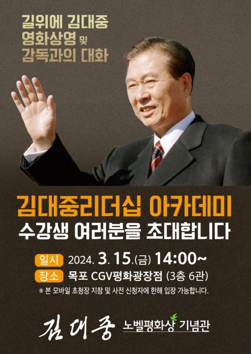 À̹ø °­Á´ ¡®±æ À§¿¡ ±è´ëÁß¡¯ ¿µÈ­ »ó¿µ ÈÄ ¹Îȯ±â °¨µ¶°úÀÇ ´ëÈ­·Î ÁøÇàµÈ´Ù. ¡®±æ À§¿¡ ±è´ëÁß¡¯Àº ´ëÇѹα¹ 15´ë ´ëÅë·É ±è´ëÁßÀÇ Åº»ý 100ÁÖ³âÀ» ±â³äÇØ Á¦ÀÛÇÑ ´ÙÅ¥¸àÅ͸® ¿µÈ­·Î ¹ÎÁÖÁÖÀǸ¦ ÇâÇÑ ÇèÇÏ°í °íµ¶ÇÑ ±æ À§¿¡ Àΰ£ ±è´ëÁßÀÌ ³²±ä À§´ëÇÑ ¿©Á¤°ú ÆÄ¶õ¸¸ÀåÇß´ø »îÀÇ ±ËÀûÀ» ´ãÀº 10¸¸ °ü°´À» µ¹ÆÄÇÑ ¿µÈ­ÀÌ´Ù.