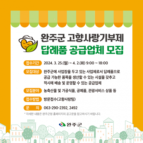 °ø¸ð Á¢¼ö ±â°£Àº ¿À´Â 25ÀϺÎÅÍ 4¿ù 2ÀϱîÁöÀ̸ç, ´ä·Êǰ °ø±ÞÀ» ¿øÇÏ´Â ¾÷ü´Â ¿ÏÁÖ±ºÃ» °æÁ¦½Äǰ°ú °íÇâ»ç¶ûÆÀÀ¸·Î ¹æ¹®ÇØ ½Åû ¼·ù¸¦ Á¢¼öÇÏ¸é µÈ´Ù.