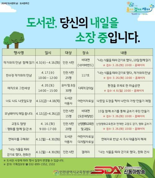 (4¿ù 12ÀϺÎÅÍ 15Àϰ£),ÀÎõ³Á¤Æòȱ³À°¿ø°ú ¿¬°èÇÑ ¡¸±³µ¿µµ ޹æ: Æòȸ¦ ÇÔ²² ÀаȾ²¡¹ ޹æ(4¿ù 16ÀÏ),°¡Á·ÀÌ ÇÔ²² Áñ±æ ¼ö ÀÖ´Â ¹®È°ø¿¬ ¡¸¸ÅÁ÷À¸·Î ±×¸°¼¼»ó¡¹ ¸¶¼ú°ø¿¬(4¿ù 20ÀÏ ¿ÀÈÄ 2½Ã) µîÀÌ´Ù. ¸¶¼ú°ø¿¬ Âü°¡ ½ÅûÀº 3¿ù 26ÀÏ ¿ÀÀü 10½ÃºÎÅÍ È¨ÆäÀÌÁö¿¡¼ ¼±Âø¼øÀ¸·Î ÇÒ ¼ö ÀÖ´Ù.