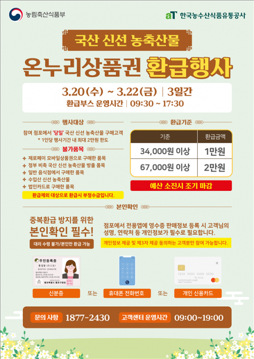 Çà»ç Âü¿© ¹æ¹ýÀº Âü¿© ÀüÅë½ÃÀå¿¡¼ ±¹»ê ½Å¼± ³óÃà»ê¹° ±¸¸Å ¿µ¼öÁõ°ú ½ÅºÐÁõÀ» ÁöÂüÇÏ¿© ÀüÅë½ÃÀå ³» ÁöÁ¤µÈ ȯ±Þ¼Ò¸¦ ¹æ¹®ÇÏ¸é µÈ´Ù. ¡ã3¸¸ 4õ¿ø ÀÌ»óÀÏ °æ¿ì´Â 1¸¸¿ø, ¡ã6¸¸ 7õ¿ø ÀÌ»óÀÏ °æ¿ì¿¡´Â 2¸¸¿øÀ¸·Î, 1Àδç 2¸¸ ¿ø Çѵµ ³»¿¡¼ ¿Â´©¸® »óǰ±ÇÀ¸·Î ȯ±Þ¹ÞÀ» ¼ö ÀÖ´Ù. »óǰ±Ç ±³È¯ ±â°£Àº ¿ÀÀü 9½Ã 30ºÐºÎÅÍ ¿ÀÈÄ 5½Ã30ºÐ±îÁö·Î ¿¹»ê ¼ÒÁø ½Ã Á¶±â Á¾·áµÉ ¼ö ÀÖ´Ù.