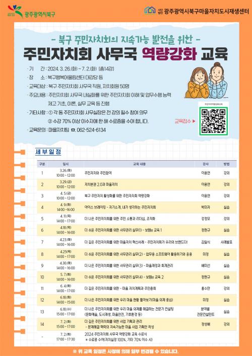 ÁÖ¹ÎÀÚġȸ »ç¹«±¹ ¿ª·® °È ±³À°Àº ºÏ±¸¸¶À»ÀÚÄ¡µµ½ÃÀç»ý¼¾ÅͰ¡ ÁÖ°üÇÏ¿© µ¿º° ÁÖ¹ÎÀÚġȸ °£ Çù·Â ³×Æ®¿öÅ©¸¦ ±¸ÃàÇϰí ÁÖ¹ÎÀÚġȸ °³³ä°ú ½ÇÁúÀûÀÎ ¿ªÇÒ ÀÌÇØ¸¦ µµ¸ðÇÏ¿© ÁÖ¹ÎÀÚġȸ ¼º°øÀûÀÎ ¸ðµ¨À» ¹ß±¼․Á¤Âø½Ã۰íÀÚ ¸¶·ÃµÆ´Ù.