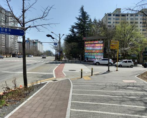 ¶ÇÇÑ ÀÚÀü°Åµµ·Î¿Í À̸鵵·Î ÃâÀÔ±¸°¡ ±³Â÷ÇÏ´Â ÁöÁ¡ Æ÷Àå ±¸°£Àº ÀÚÀü°Å Ⱦ´Ü³ë¸éÇ¥½Ã¸¦ ¾ÏÀû»öÀ¸·Î Ç¥½ÃÇØ ÀÚÀü°Å¿Í º¸ÇàÀÚ ¸ðµÎ ¾ÈÀüÇÏ°í Æí¸®ÇÏ°Ô À̵¿ÇÒ ¼ö ÀÖµµ·Ï Á¶Ä¡Çϱâ·Î Çß´Ù.