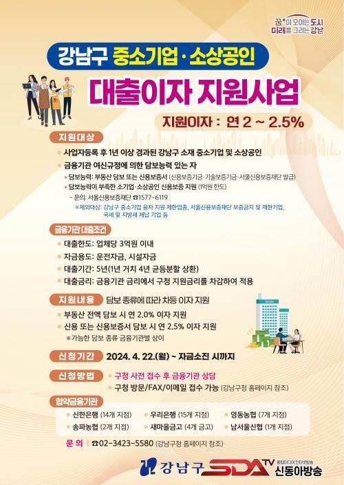 ´ëÃâ¿ø±Ý ÃÑ 1000¾ï ¿ø ±Ô¸ðÀÇ Áö¿ø »ç¾÷À¸·Î, ¾÷ü´ç ÃÖ´ë 3¾ï ¿øÀÇ ´ëÃâ¿ø±Ý¿¡ ´ëÇÑ ±Ý¸®¸¦ ±¸¿¡¼ ¿¬ 2~2.5%¸¦ Áö¿øÇÏ°í ³ª¸ÓÁö ÀÌÀÚ¸¦ º»ÀÎÀÌ ºÎ´ãÇÏ´Â ¹æ½ÄÀÌ´Ù. ºÎµ¿»ê ´ãº¸ÀÇ °æ¿ì ¿¬ 2%, ½Å¿ë ´ãº¸ÀÇ °æ¿ì ¿¬ 2.5%·Î ÃÖ´ë 5³â±îÁö Áö¿øÇÑ´Ù.