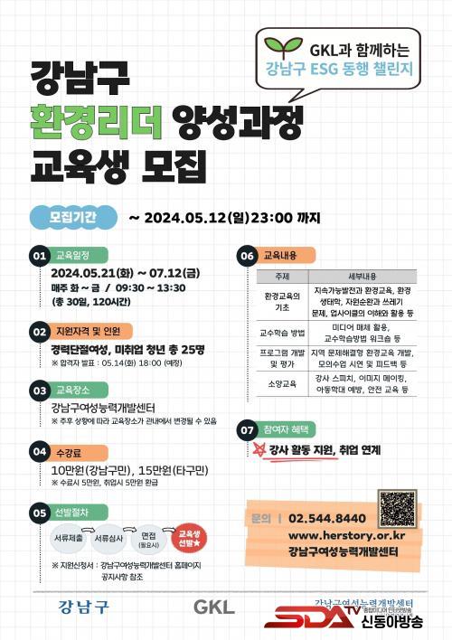 ȯ°æ ¸®´õ ¾ç¼º ±³À°Àº °³²±¸¿©¼º´É·Â°³¹ß¼¾ÅÍ¿¡¼ ÁøÇàµÈ´Ù. ½Å±Ô¹Ý°ú °æ·Â¹ÝÀ¸·Î ³ª´² ÁøÇàµÇ¸ç, 5¿ù 12ÀϱîÁö ½Å±Ô¹Ý ±³À° ´ë»óÀÚ 25¸íÀ» ¸ðÁýÇÑ´Ù. 5¿ù 21ÀÏ~7¿ù 12ÀÏ ¸ÅÁÖ È¿äÀÏ~±Ý¿äÀÏ(9½Ã 30ºÐ~13½Ã 30ºÐ) ÃÑ 120½Ã°£À» ±³À°ÇÑ´Ù. °æ·Â¹ÝÀº Áö³ÇØ ¼ö·áÇÑ °»ç¸¦ ´ë»óÀ¸·Î ÃÑ 30½Ã°£ ¿ª·® °È ±³À°À» ÁøÇàÇÑ´Ù. ±³À° ¼ö°·á´Â 10¸¸ ¿ø(±¸¹ÎÀÌ ¾Æ´Ñ °æ¿ì 15¸¸¿ø)ÀÌ¸ç ¼ö·á¿Í Ãë¾÷ ½Ã °¢°¢ 5¸¸ ¿ø¾¿ 10¸¸ ¿øÀ» ¸ðµÎ ȯ±ÞÇØÁØ´Ù. ±³À° ½Åû ¹× ¹®ÀÇ´Â ¼¾ÅÍ(¢Ï02-544-8454)·Î ¿¬¶ôÇÏ¸é µÈ´Ù.