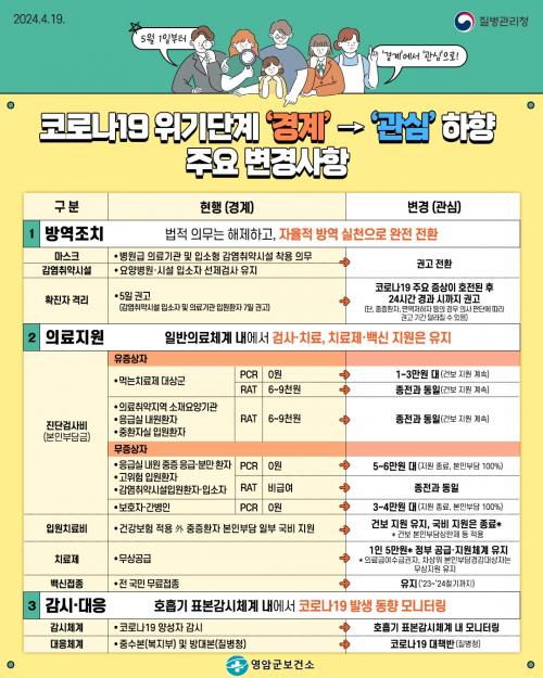 ¹æ¿ªÁ¶Ä¡´Â º´¿ø±Þ ÀÇ·á±â°ü°ú ÀÔ¼ÒÇü °¨¿° Ãë¾à½Ã¼³ µîÀÇ ½Ç³» ¸¶½ºÅ© Âø¿ë Àǹ«¿Í ¿ä¾çº´¿ø¡¤½Ã¼³ ÀÔ¼ÒÀÚ ¼±Á¦ °Ë»ç°¡ ¡®±Ç°í¡¯·Î ¹Ù²î°í, È®ÁøÀÚ °Ý¸®´Â 5ÀÏ ±Ç°í¿¡¼ Áõ»ó È£ÀüµÈ ÈÄ 24½Ã°£ ±Ç°í·Î ÀüȯµÈ´Ù.
