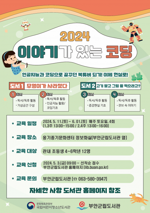 [½Åµ¿¾Æ¹æ¼Û=À¯¸íÁø±âÀÚ] ºÎ¾È±º¸³µµ¼­°üÀÌ ±¹¸³¾î¸°ÀÌû¼Ò³âµµ¼­°ü ÁÖ°ü ¡®2024³â À̾߱Ⱑ ÀÖ´Â ÄÚµù¡¯ »ç¾÷¿¡ ¼±Á¤µÇ¾î Âü¿©ÀÚ¸¦ ¸ðÁý ÁßÀ̸ç, ¸ðÁý´ë»óÀº °ü³» ÃʵîÇлý 4 ~ 6Çг⠼±Âø¼ø 12¸íÀÌ´Ù.