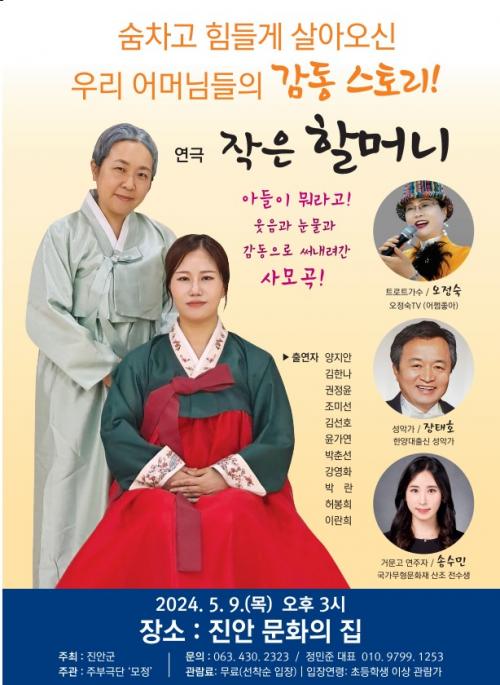 [½Åµ¿¾Æ¹æ¼Û=À̺´½Ä±âÀÚ] Áø¾È±ºÀÌ ¿À´Â 9ÀÏ(¸ñ) ¿ÀÈÄ 3½Ã ¹®È­ÀÇ Áý ¸¶ÀÌȦ¿¡¼­ ¿¬±Ø ¡®ÀÛÀºÇÒ¸Ó´Ï¡¯ °ø¿¬À» ¼±º¸ÀδÙ.