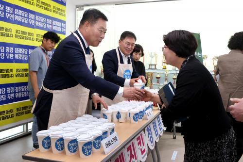 ȸÀÇ¿¡ ¾Õ¼­ ¡®±º¼ö°¡ ÀüÇϴ û·Å ¼ÒÅë Ä¿ÇÇ¡¯ ³ª´® Çà»ç¸¦ ¿­¾î ±è»ê ±º¼ö°¡ Á÷¿øµé¿¡°Ô Á÷Á¢ ´Ù¾çÇÑ Ã»·Å¸Þ½ÃÁö°¡ ´ã±ä û·Å ¼ÒÅë Ä¿ÇÇ¿Í °£½ÄÀ» ³ª´²ÁÖ¸ç Á÷¿øµéÀ» °Ý·ÁÇϰí û·ÅÀÇ Àǹ̸¦ ÇÔ²² ´ÙÁ³´Ù.