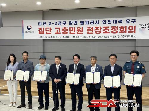 ÀÎõ ¼±¸¸¦ ºñ·ÔÇÑ 4°³ ±â°üÀÌ ÇÕÀÇÇÑ À̹ø Á¶Á¤ ÇùÀÇ´Â, °Ë´Ü½Åµµ½Ã ºÒ·Îµ¿ °ø»ç ÇöÀå¿¡¼ ¹ß°ßµÈ ´ë±Ô¸ð ¾Ï¹ÝÀÇ ¹ßÆÄ ¹®Á¦ ÇØ°áÀ» À§ÇØ ½ÃÀ۵ƴÙ. ÁöÇÏ ¾Ï¹ÝÀº °¡·Î 80m, ¼¼·Î 130m, ³ôÀÌ 26mÀÇ ±Ô¸ðÀ̸ç, ¾Ï¹ÝÀ¸·ÎºÎÅÍ 80m Àαٿ¡ ÁÖ°Å´ÜÁö°¡ ÀÎÁ¢ÇØ ÀÖ¾î, ¹ßÆÄ·Î ÀÎÇÑ ¼ÒÀ½, Áøµ¿, ¾ÈÀü¼º µîÀÇ ¹®Á¦°¡ ´ëµÎµÇ¾ú´Ù. ±×µ¿¾È ÇöÀå Àα٠2,600¿© ¼¼´ëÀÇ Áö¿ª ÁֹεéÀº ºñ´ëÀ§¸¦ ±¸¼ºÇß°í, Çѱ¹ÅäÁöÁÖÅðø»ç. ¼±¸Ã» µî °ü°è ±â°üµé°ú ±¼Âø °ø¹ý°ú ÁֹΠºÒÆí »çÇ× µî¿¡ ´ëÇØ, »óÈ£ ÇùÀÇÇÑ ³¡¿¡ À̹ø¿¡ ÇÕÀÇ¿¡ À̸£°Ô µÆ´Ù.