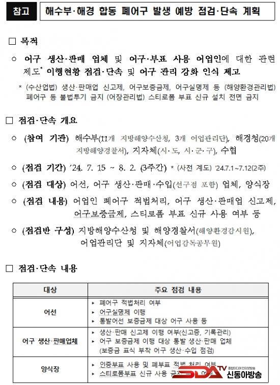 ÀÌ¿¡ Áö¹æÇؾç¼ö»êû, ¾î¾÷°ü¸®´Ü, ÇØ¾ç°æÂû¼­, ÁöÀÚü µî °ü°è±â°ü ÇÕµ¿À¸·Î ¾î¼±¿¡¼­ ¹ß»ýÇÏ´Â Æó¾î±¸ÀÇ Àû¹ýó¸® ¿©ºÎ¸¦ ÁßÁ¡ È®ÀÎÇϰí, ¾î±¸ »ý»ê¤ýÆÇ¸Å¾÷ ½Å°íÁ¦, ¾î±¸º¸Áõ±ÝÁ¦, ½ºÆ¼·ÎÆûºÎÇ¥ ½Å±Ô »ç¿ë ±ÝÁö µîÀÇ ¾î±¸・ºÎÇ¥ °ü¸®Á¦µµÀÇ ÇöÀå ÀÌÇà ½ÇÅÂÁ¡°Ë°ú ´Ü¼ÓÀ» º´ÇàÇÒ °èȹÀÌ´Ù.