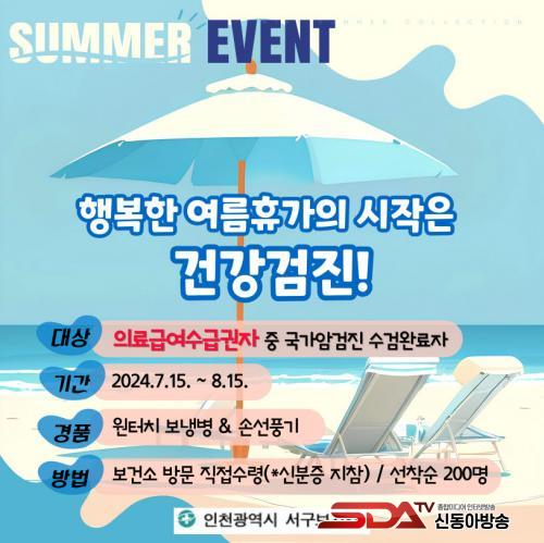 ¿À´Â 8¿ù 15ÀϱîÁö °Ç°­°ËÁø ¹× ±¹°¡¾Ï°ËÁøÀ» ¹ÞÀº ÀÇ·á±Þ¿©¼ö±Þ±ÇÀÚ(¼­±¸ °ÅÁÖ)¸¦ ´ë»óÀ¸·Î ÁøÇàµÇ¸ç, Âü¿© ¹æ¹ýÀº ÇØ´ç ±â°£(7.15.~8.15.) ³» °ËÁø¹ÞÀº ´ë»óÀÚ°¡ ½ÅºÐÁõ°ú °ËÁø °á°úÁö¸¦ ÁöÂüÇÏ¿© ¼­±¸º¸°Ç¼Ò(¹æ¹®º¸°ÇÆÀ)¿¡ ¹æ¹®ÇÏ¸é °æÇ°À» ¼ö·É ÇÒ ¼ö ÀÖ´Ù. °æÇ°Àº ¿øÅÍÄ¡ º¸³Ãº´ ¹× ¼Õ¼±Ç³±â·Î ¼±Âø¼ø 200¸í¿¡°Ô Áö±ÞµÈ´Ù.