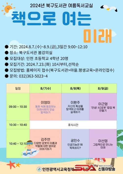 ºÏ±¸µµ¼­°ü ¿©¸§µ¶¼­±³½ÇÀº 7¿ù 23ÀϺÎÅÍ ºÏ±¸µµ¼­°ü ȨÆäÀÌÁö¿¡¼­ ½ÅûÇÒ ¼ö ÀÖÀ¸¸ç, ´õ ÀÚ¼¼ÇÑ »çÇ×Àº ºÏ±¸µµ¼­°ü ȨÆäÀÌÁö(https://lib.ice.go.kr/bukgu)¸¦ Âü°íÇϰųª ¾î¸°ÀÌÀÚ·á½Ç(¢Ï032-363-5024)·Î ¹®ÀÇÇÏ¸é µÈ´Ù.
