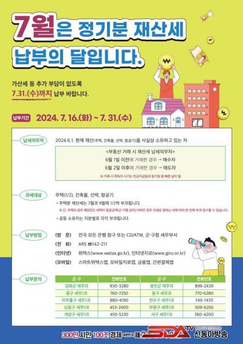 Àç»ê¼¼ ³³ºÎ ±â°£Àº 7¿ù 31ÀÏÀ̸ç, ÀºÇà¿¡ Á÷Á¢ ¹æ¹®ÇÏ¿© ³³ºÎÇØµµ µÇÁö¸¸ Áö¹æ¼¼³³ºÎ½Ã½ºÅÛÀÎ À§Åýº(www.wetax.go.kr), ¿Â¶óÀÎ °èÁÂÀÌü, ½º¸¶Æ®Æù ¾Û(½º¸¶Æ® À§Åýº) ¹× ARS(ÅÚ·¹¹ðÅ·)·Î ³³ºÎÇÏ¸é °øÈÞÀϰú ¾ß°£¿¡µµ Æí¸®ÇÏ°Ô ³³ºÎÇÒ ¼ö ÀÖ´Ù. Àç»ê¼¼ °íÁö¼­¸¦ ¹ÞÀº ÈÄ ±Ã±ÝÇÑ »çÇ×Àº ¼ÒÀ¯Çϰí ÀÖ´Â ¹°°ÇÀÇ ¼ÒÀçÁö ±º±¸ ¼¼¹«ºÎ¼­¿¡ ¹®ÀÇÇϸé ÀÚ¼¼ÇÏ°Ô ¾È³»¹ÞÀ» ¼ö ÀÖ´Ù.
