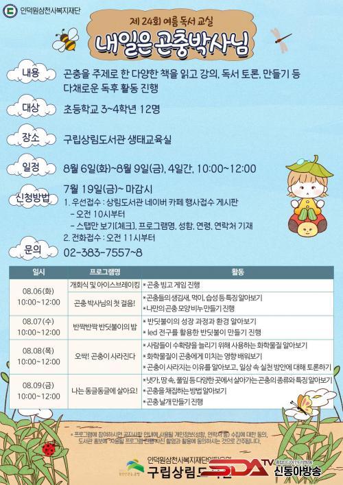 ¿©¸§ µ¶¼±³½ÇÀº ³»´Þ 6ÀϺÎÅÍ 9ÀϱîÁö Ã¥À» ÅëÇØ °ïÃæ¿¡ ´ëÇØ ¾Ë¾Æº¸´Â ³»¿ëÀ¸·Î ¿¸°´Ù. »ýÅÂ¿Í ÀÚ¿¬º¸È£¿¡ ´ëÇÑ ¾î¸°À̵éÀÇ °ü½ÉÀ» ³ôÀÏ ¼ö ÀÖµµ·Ï Åä·Ð, ¸¸µé±â, ÄûÁî µî ´Ùä·Î¿î µ¶ÈÄ È°µ¿À» ÁøÇàÇÑ´Ù.
