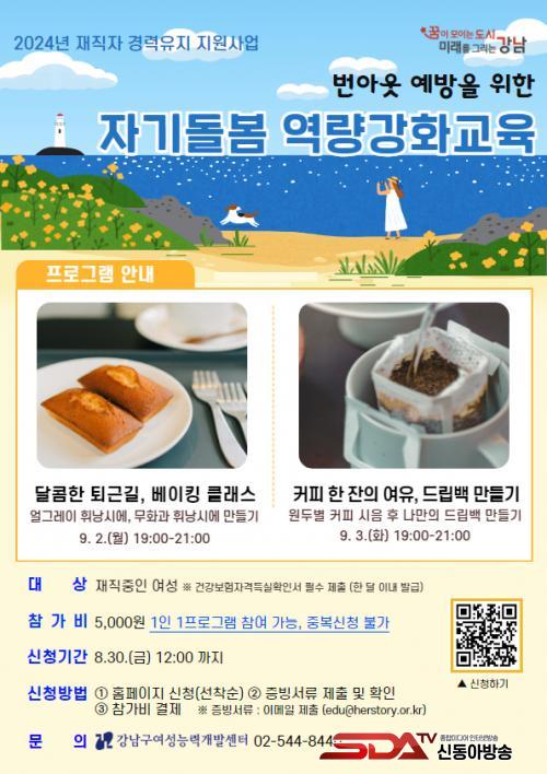 °³²±¸¿©¼º´É·Â°³¹ß¼¾ÅÍ È¨ÆäÀÌÁö(www.gangnam.go.kr/office/herstory)¿¡¼ ÀÚ¼¼ÇÑ ¼ö¾÷ ³»¿ëÀ» È®ÀÎÇÏ°í ¼ö° ½ÅûÇÏ¸é µÈ´Ù. 8¿ù 30ÀÏ 12½Ã±îÁö ½ÅûÀ» ¹Þ´Â´Ù. º£ÀÌÅ·¡¤Ä¿ÇÇ °ÀÇ´Â ¼¾ÅÍ¿¡¼ ÀÌ·ïÁö¸ç, ³ª¸ÓÁö °ÀÇ´Â ºñ´ë¸éÀ¸·Î ÁøÇàÇÑ´Ù. ÀçÁ÷ ¿©¼ºÀÓÀ» ÁõºùÇϱâ À§ÇØ ÇÑ ´Þ À̳» ¹ß±ÞÇÑ °Ç°º¸ÇèÀڰݵæ½ÇÈ®Àμ¸¦ Á¦ÃâÇØ¾ß ÇÑ´Ù.