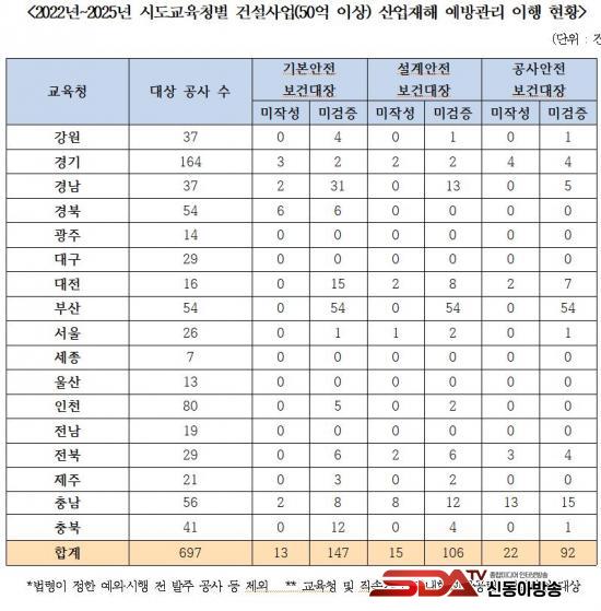 ¡à 50¾ï ¿ø ÀÌ»ó ±³À°Ã» °ü³» ´ëÇü°ø»ç¿¡¼­ ÀÛ¼º¡¤°ËÁõÇØ¾ß ÇÏ´Â ¾ÈÀüº¸°Ç´ëÀå ¹ÌÀÌÇà ÇöȲÀ» º¸¸é, Àüü ´ë»ó °ø»ç 697°Ç Áß ±âº»¾ÈÀüº¸°Ç´ëÀå 160°Ç, ¼³°è¾ÈÀüº¸°Ç´ëÀå 121°Ç, °ø»ç¾ÈÀüº¸°Ç´ëÀå 114°Ç¿¡¼­ ÀÛ¼º ¶Ç´Â °ËÁõÀÌ ÀÌ·ïÁöÁö ¾ÊÀº °ÍÀ¸·Î ³ªÅ¸³µ´Ù. ƯÈ÷ ºÎ»ê¡¤Ãæ³²¡¤°æ³² µî ÀϺΠ±³À°Ã»Àº ´Ù¼öÀÇ ¹ÌÀÌÇà »ç·Ê°¡ È®ÀεŠ¹ýÀû Àǹ«°¡ ÇöÀå¿¡¼­ Á¦´ë·Î ÀÛµ¿ÇÏÁö ¾Ê°í ÀÖÀ½À» È®ÀÎÇß´Ù.