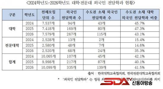¡à Àüü ¿Ü±¹ÀÎ Àü´ãÇаú´Â 2024³âÇг⵵ 107°³¿¡¼ 2026³âÇг⵵ 335°³·Î ´Ã¾ú´Ù. ÀÌ °¡¿îµ¥ ¼öµµ±Ç ´ëÇÐÀº 43°³¿¡¼ 115°³, Àü¹®´ëÇÐÀº 2°³¿¡¼ 24°³·Î ±ÞÁõÇß´Ù. ¼öµµ±Ç ºñÁßÀº 42.1%(¡¯24) ¡æ 40.1%(¡¯25) ¡æ 41.5%(¡¯26)·Î ³ªÅ¸³ª ¿Ü±¹ÀÎ Àü´ãÇаúÀÇ ¼öµµ±Ç ½ò¸²ÀÌ µÎµå·¯Á³´Ù.