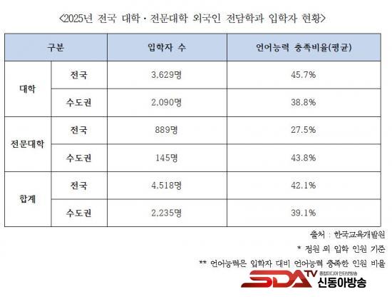 ¡à Çѱ¹±³À°°³¹ß¿ø ÀÚ·á¿¡ µû¸£¸é, 2025³â Àüü ´ëÇÐÀÇ ¿Ü±¹ÀÎ Àü´ãÇаú ÀÔÇлýÀº 4,518¸íÀ¸·Î Áý°èµÆ´Ù. ÀÌ °¡¿îµ¥ ¼öµµ±Ç ÀÔÇлýÀº 2,235¸í(49.5%)À¸·Î Àý¹Ý¿¡ °¡±î¿ü´Ù. À¯ÇлýµéÀÇ ¾ð¾î´É·Â ÃæÁ·ºñÀ²(ÇÕ°è ±âÁØ)Àº Àü±¹ Æò±ÕÀÌ 42.1%, ¼öµµ±Ç ´ëÇÐÀº À̺¸´Ù ³·Àº 39.1%¿¡ ºÒ°úÇß´Ù. ¿Ü±¹ÀÎ Àü´ãÇаú È®´ë¸¦ ÅëÇÑ À¯Çлý À¯Ä¡¿¡ Ä¡ÁßÇÏ´Â »çÀÌ, Á¤ÀÛ ±âÃÊ ¾ð¾î´É·Â µî Çо÷ ¼öÇà¿¡ ´ëÇÑ °ü¸®´Â ¹ÌÈíÇÏ´Ù´Â ºñÆÇÀÌ Á¦±âµÈ´Ù.