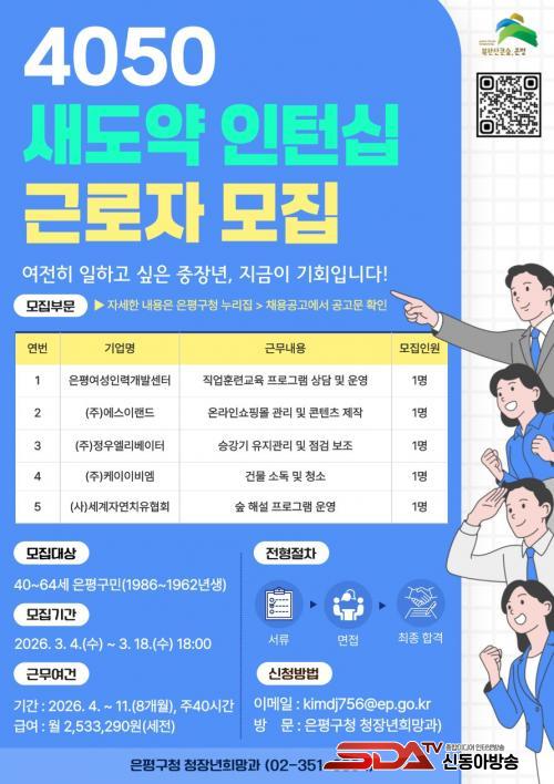 [½Åµ¿¾Æ¹æ¼Û ÀºÆò±¸=À̽ŵ¿±âÀÚ] ¼­¿ï ÀºÆò±¸(±¸Ã»Àå ±è¹Ì°æ)´Â ÁßÀå³âÃþÀÇ ÀçÃë¾÷ ¿ª·® °­È­¸¦ À§ÇØ ¡®2026³â 4050 »õµµ¾à ÀÎÅÏ½Ê ÇÁ·Î±×·¥¡¯ Âü¿©ÀÚ¸¦ ¿À´Â 18ÀϱîÁö ¸ðÁýÇÑ´Ù°í ¹àÇû´Ù.