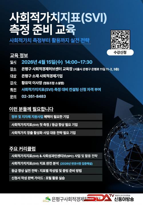 ±³À° ´ë»óÀº ÀºÆò±¸ ¼ÒÀç »çȸÀû°æÁ¦±â¾÷À̸ç, ¿À´Â 14ÀϱîÁö ½Åû °¡´ÉÇÏ´Ù. Âü¿©¸¦ Èñ¸ÁÇÏ´Â ±â¾÷Àº È«º¸¹° ³» Å¥¾Ë(QR)Äڵ带 ÅëÇØ ¿Â¶óÀÎÀ¸·Î ½ÅûÇÒ ¼ö ÀÖ´Ù. ÀÚ¼¼ÇÑ »çÇ×Àº ÀºÆò±¸ »çȸÀû°æÁ¦Çãºê¼¾ÅÍ(02-351-8483)·Î ¹®ÀÇÇÏ¸é µÈ´Ù.