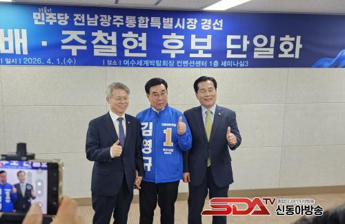 [½Åµ¿¾Æ¹æ¼Û ¿©¼ö=±è±â³² ±âÀÚ] Àü³²¡¤±¤ÁÖ ÅëÇÕÆ¯º°½ÃÀå ¼±°Å¸¦ ¾ÕµÎ°í ´õºÒ¾î¹ÎÁÖ´ç °æ¼±¿¡ ³ª¼± ÁÖöÇö Èĺ¸¿Í ¹ÎÇü¹è Èĺ¸ÀÇ ´ÜÀÏÈ­¿¡ ´ëÇØ ±è¿µ±Ô ¿©¼ö½ÃÀå ¿¹ºñÈ帰¡ 1ÀÏ È¯¿µ ÀÔÀåÀ» ¹àÇû´Ù.