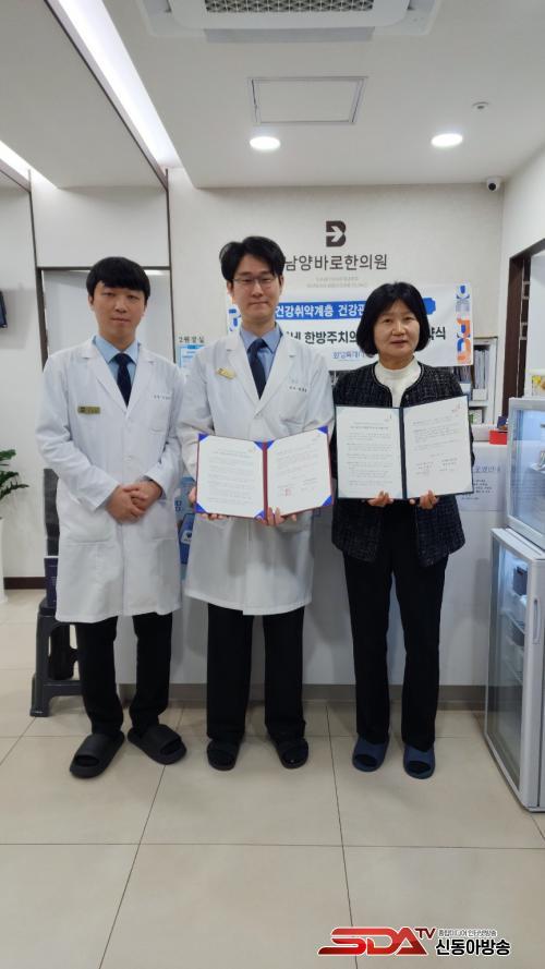 »çÁø= ¸¸¼¼±¸º¸°Ç¼Ò ¾ÈÁø¼÷ ¹æ¹®ÆÀÀå(¿À¸¥ÂÊ)°ú ³²¾ç¹Ù·ÎÇÑÀÇ¿ø ÇÑ¿µÈÆ ´ëÇ¥¿øÀå(°¡¿îµ¥), ±èµ¿Çö ºÎ¿øÀå(¿ÞÂÊ)ÀÌ ¡®¿ì¸®µ¿³× ÇѹæÁÖÄ¡ÀÇ»ç¾÷¡¯ ÃßÁøÀ» À§ÇÑ ¾÷¹«Çù¾àÀ» ü°áÇÑ µÚ Çù¾à¼­¸¦ µé°í ±â³äÃÔ¿µÀ» Çϰí ÀÖ´Ù.
