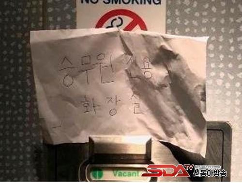 ÀÌ ºñÇà±â¿¡ Ÿ°í ÀÖ´Â Çѱ¹ÀÎ ½Â°´Àº ÈÀå½Ç ¹® ¾Õ¿¡ "½Â¹«¿ø Àü¿ë ÈÀå½Ç"À̶ó°í ÀûÈù ¾È³»¹®À» ¹ß°ßÇß´Ù. °®°í ÀÖ´ø ÇÚµåÆùÀ¸·Î ¾È³»¹®À» »çÁø ÂïÀº µÚ, ÇÔ²² ºñÇà±â¿¡ ÀÖ´ø µ¿·á¿Í ´ëȸ¦ ³ª´ ¶§, KLM Ãø ½Â¹«¿øÀÌ ´Ù°¡¿Ô´Ù°í ÇÑ´Ù. ÀÌ ½Â¹«¿øÀÌ "»çÁøÀ» Áö¿ì¶ó"°í ÇÏ¸é¼ °¥µîÀÌ ½ÃÀ۵ƴÙ.