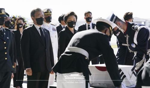 ¹® ´ëÅë·ÉÀº ÀÌ °¡¿îµ¥ ÇÑ¡¤¹Ì À¯ÇØ »óÈ£ Àμö½Ä, ±¹±º Àü»çÀÚ À¯ÇØ ºÀȯ½ÄÀ» ÁÖ°üÇß´Ù. ¹Ì±º À¯ÇØ ºÀ¼Û½ÄÀº ±¹¹æºÎ ÀÚü Çà»ç·Î ¼¿í ±¹¹æºÎ Àå°üÀÌ ÁÖ°üÇß´Ù. ¹® ´ëÅë·ÉÀÌ ±¹±º Àü»çÀÚ À¯ÇØ ºÀȯ½ÄÀ» ÁÖ°üÇÑ °ÍÀº À̹øÀÌ ¼¼ ¹øÂ°´Ù.
