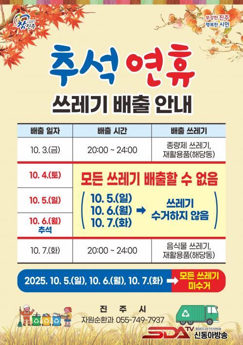 ÀÌ ¹Û¿¡µµ ¿¬ÈޱⰣ Áß 10¿ù 5, 6, 7ÀÏ 3Àϰ£Àº ¸ðµç ¾²·¹±â¸¦ ¼ö°ÅÇÏÁö ¾ÊÀ¸¹Ç·Î 4~6ÀÏÀº ¾²·¹±â¸¦ ¹èÃâÇÏÁö ¾Êµµ·Ï À¯ÀÇÇØ¾ß Çϸç, ÀÚ¼¼ÇÑ »çÇ×Àº ÁøÁֽà ´©¸®Áý(½ÃÁ¤¼Ò½Ä>¾Ë¸²Ã¢)¿¡¼­ È®ÀÎ °¡´ÉÇÏ´Ù.