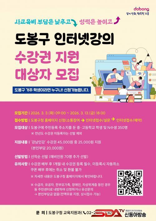 [½Åµ¿¾Æ¹æ¼Û µµºÀ±¸=À̽ŵ¿±âÀÚ] ¼­¿ï µµºÀ±¸°¡ ¡®2026³â ÀÎÅͳݰ­ÀÇ ¼ö°­±Ç Áö¿ø»ç¾÷¡¯ ´ë»óÀÚ¸¦ ¸ðÁýÇÑ´Ù.