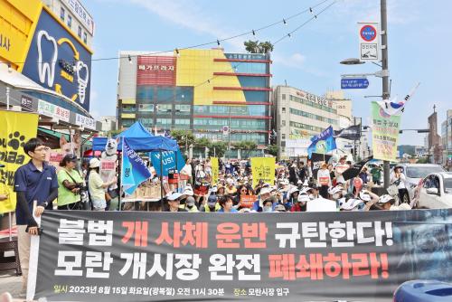 [½Åµ¿¾Æ¹æ¼Û=À̽ŵ¿±âÀÚ]8¿ù 15ÀÏ ±¤º¹Àý ¸ð¶õ°¡Ãà½ÃÀå ¾Õ¿¡¼­ ºÒ¹ý °³ »çü ¿î¹Ý ±Ôź ¹× ¸ð¶õ °³½ÃÀå ¿ÏÀü Æó¼â¸¦ ¿ä±¸ÇÏ´Â ±âÀÚ È¸°ß ¹× Áýȸ°¡ ¿­·È´Ù. µ¿¹°º¸È£´Üü Çà°­, À¯¾öºü, µ¿¹°±ÇÇൿ Ä«¶ó ÁÖ°üÀ¸·Î ¿­¸° À̳¯ Áýȸ¿¡´Â ÃÑ 23°³ µ¿¹°º¸È£´Üü ¹× ½Ã¹ÎµéÀÌ ¡¦